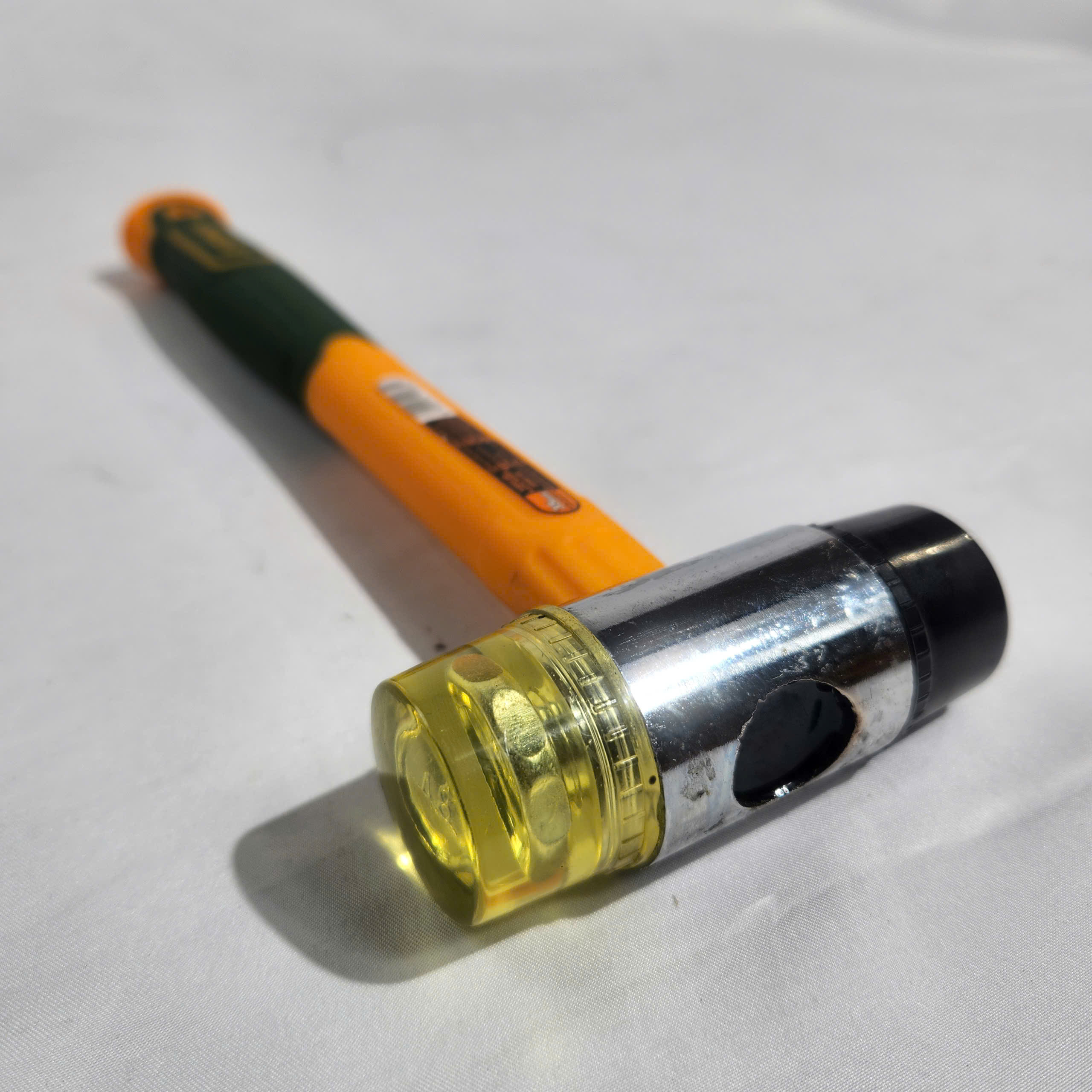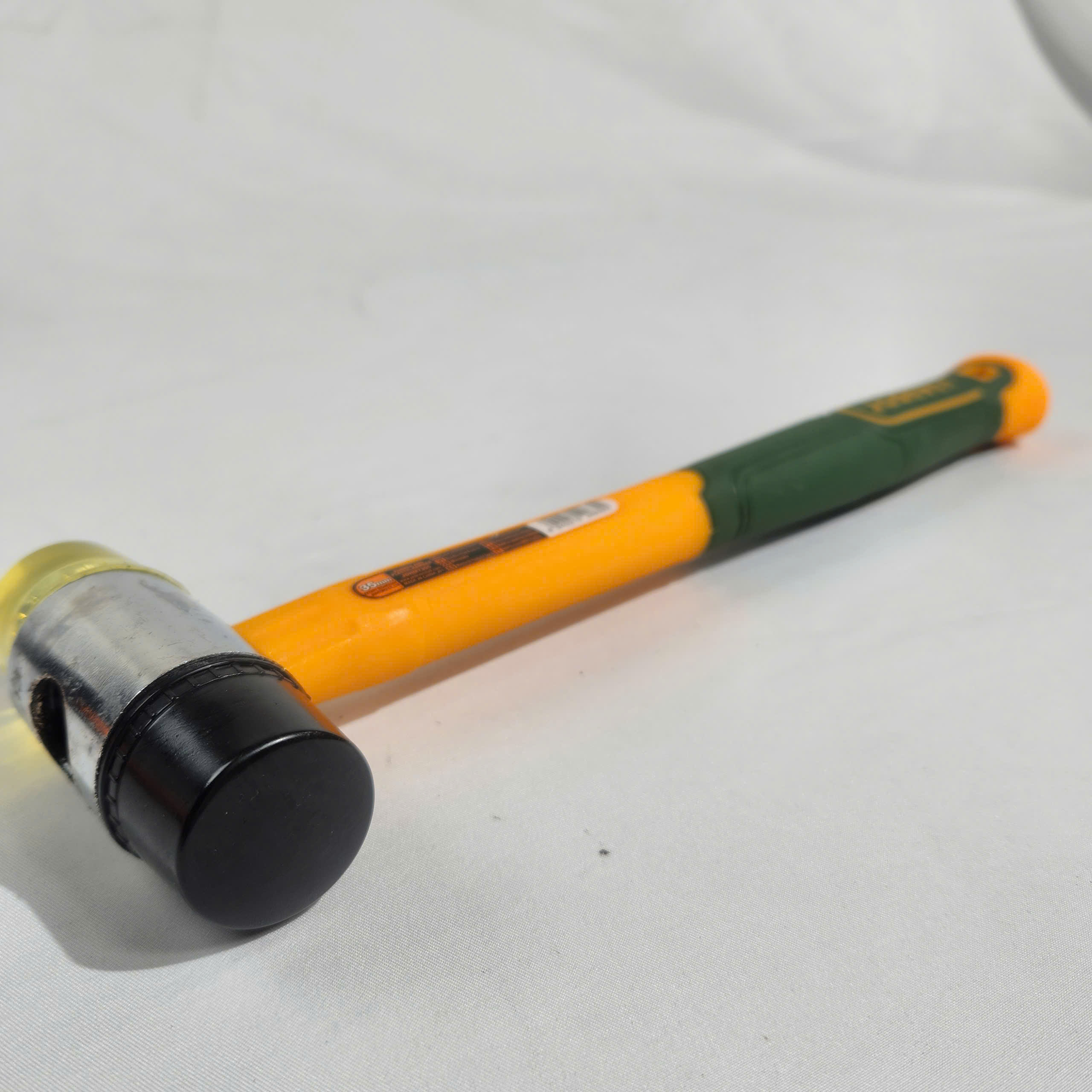 - Phần đầu búa được thiết kế kết hợp giữa cao su và nhựa, giúp lực gõ được phân bổ đều, hạn chế để lại dấu vết trên bề mặt gỗ, nhôm, gạch hoặc các vật liệu dễ trầy xước. Đường kính 35mm mang lại lực gõ vừa phải, dễ kiểm soát khi thao tác.