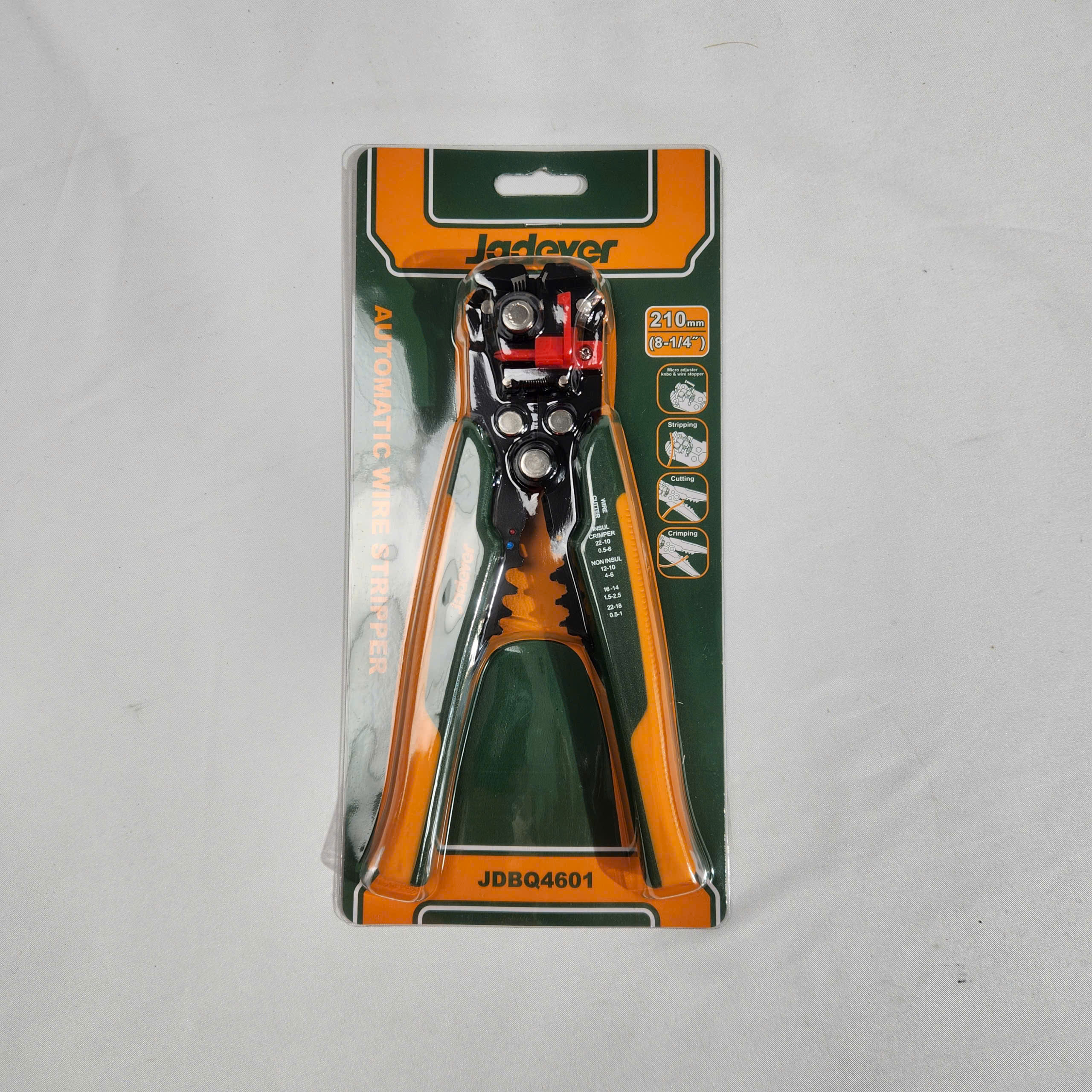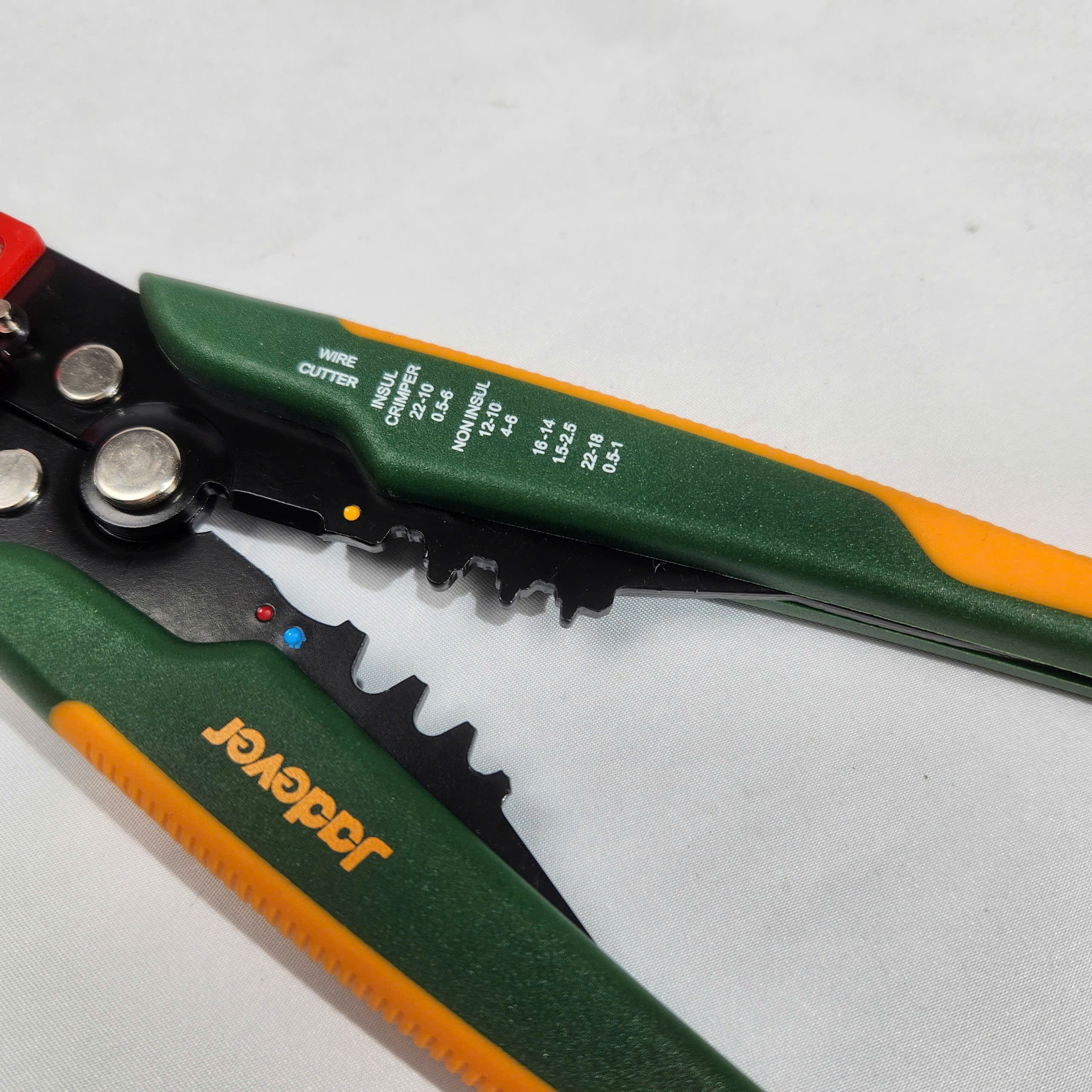 - Ngoài chức năng tuốt dây, JDBQ4601 còn tích hợp khả năng cắt dây và bấm đầu cos, giúp tối ưu công việc chỉ với một dụng cụ duy nhất. Lưỡi kìm được làm từ thép cứng, sắc bén, đảm bảo độ bền và hiệu suất sử dụng lâu dài.